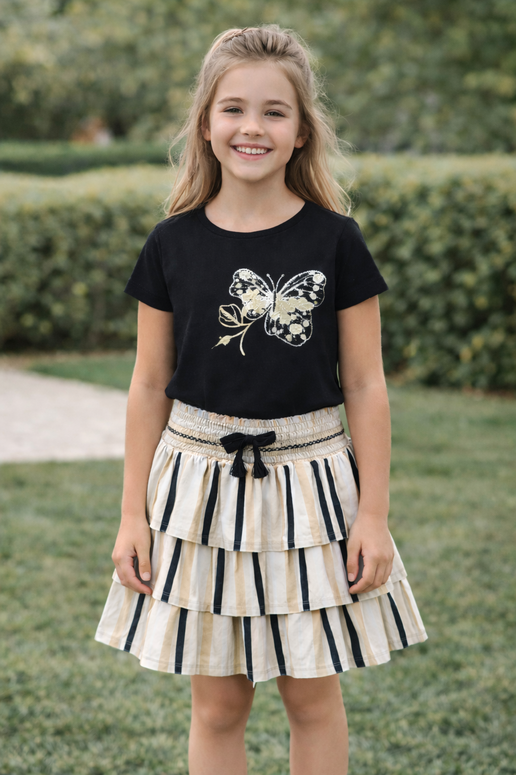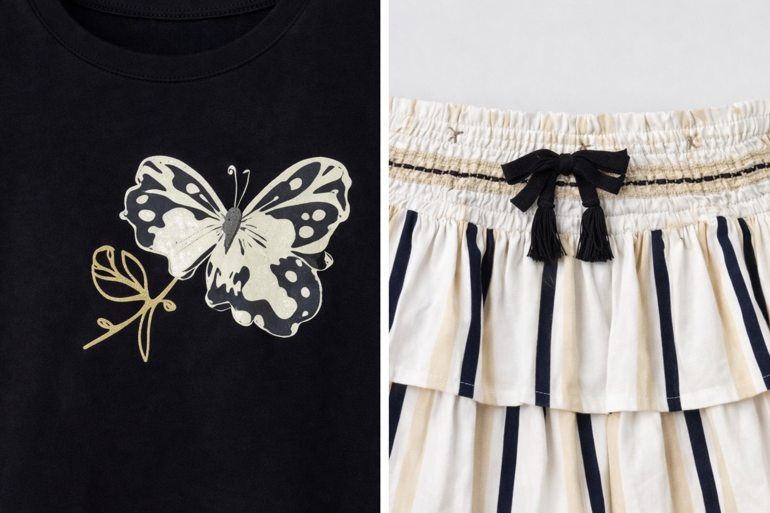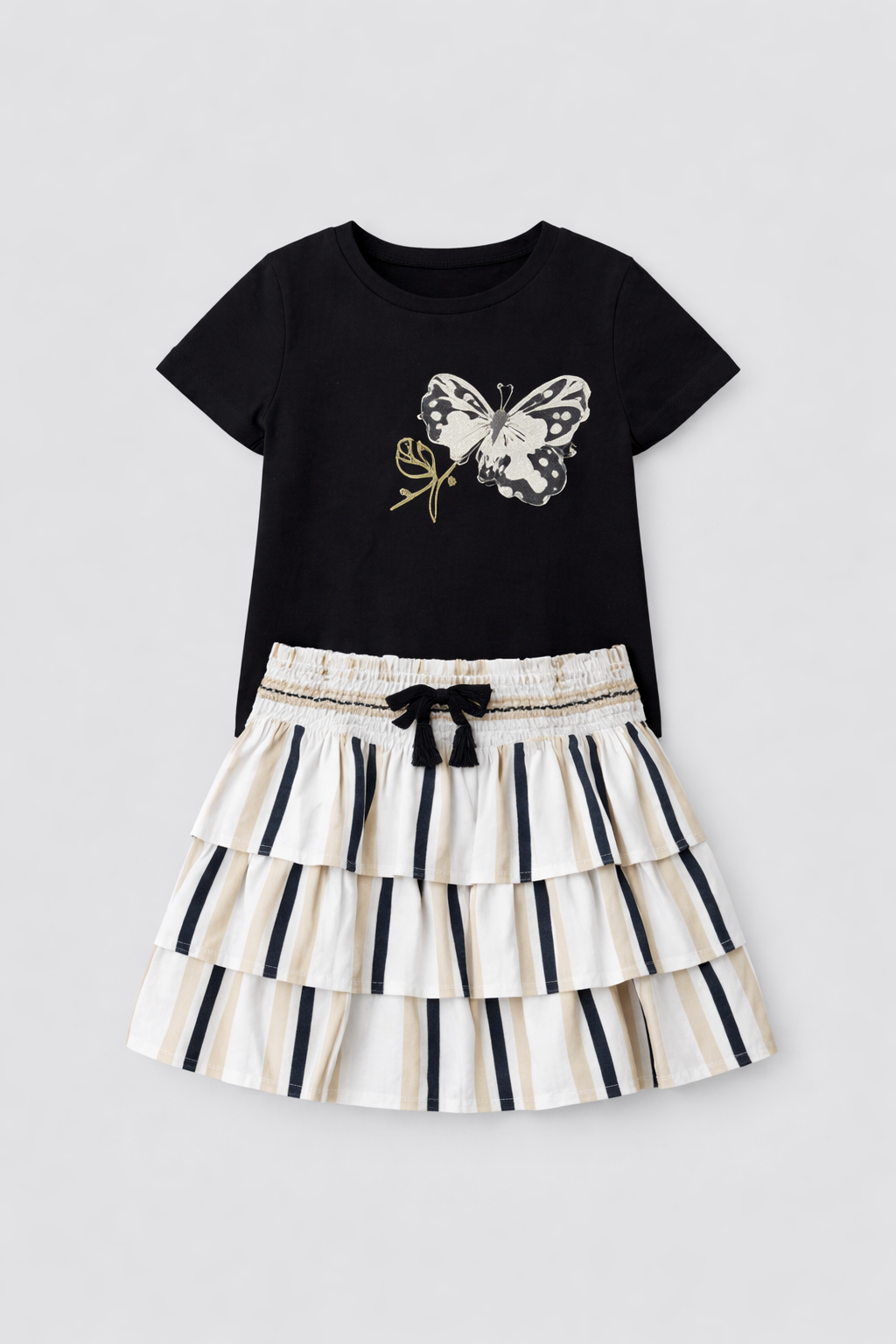 Cet ensemble fille associe élégance et douceur avec un t-shirt noir orné d’un délicat motif papillon doré, accompagné d’une jupe à volants rayée beige et noir pour une allure chic et moderne.